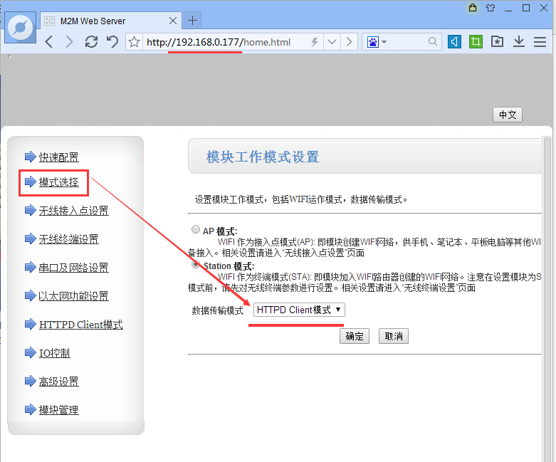7:然后進入WiFi模塊的配置網(wǎng)頁,把模塊配置為HTTPD_client協(xié)議。