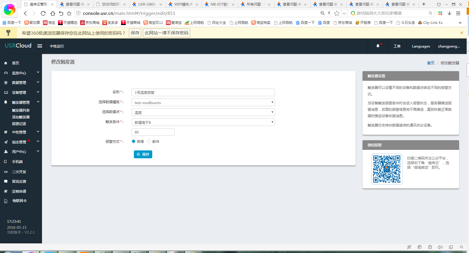12、關(guān)注有人物聯(lián)網(wǎng)公眾號,點(diǎn)擊右下角透傳云,登錄賬號,報(bào)警信息可以推送至微信