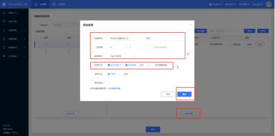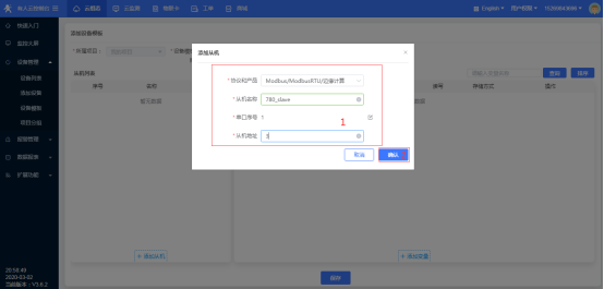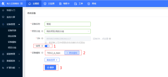 2、登錄有人云組態(tài)平臺(tái),在設(shè)備管理界面添加設(shè)備,設(shè)備IMEI和SN編號(hào)唯一,可以在設(shè)備背面標(biāo)簽查看。點(diǎn)擊下一步,選擇相應(yīng)的模板,點(diǎn)擊保存;完善從機(jī)信息和從機(jī)數(shù)據(jù)點(diǎn)(要采集的PLC或終端設(shè)備的寄存器地址)。