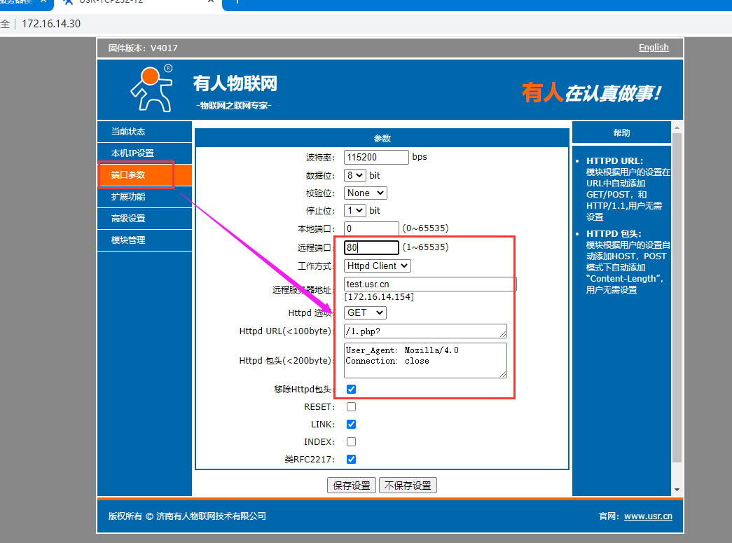 2.內置網頁設置,根據M0搜索到動態(tài)獲取的IP地址進入內置網頁。點擊httpd client 模式,HTTP服務器地址:test.usr.cn, HTTP服務器端口號為80,HTTP報頭路徑為/1.php?,設置完成點擊保存設置,在模塊管理點擊重啟生效。
