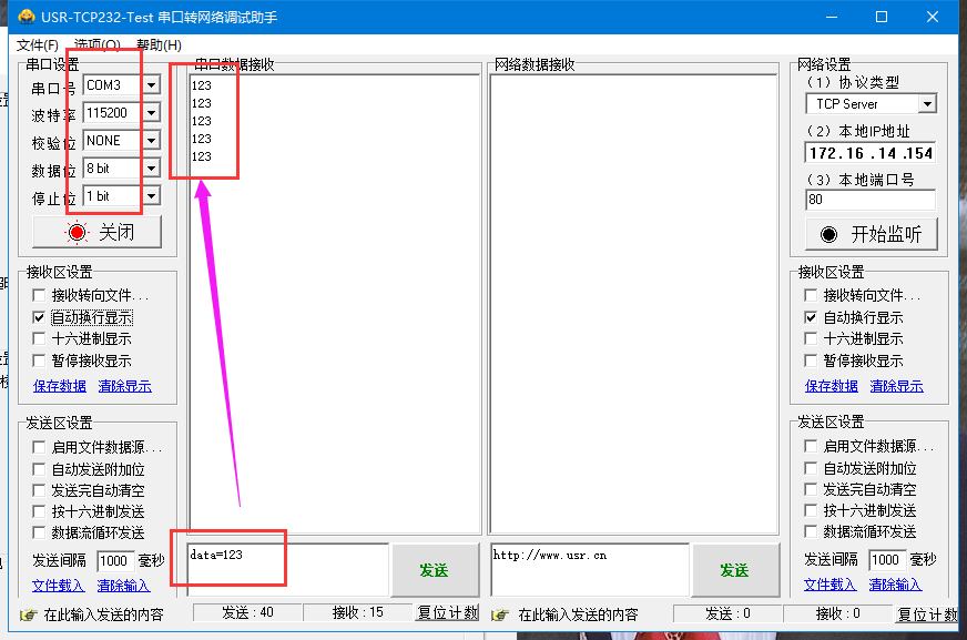 4.打開小黃人軟件,選擇串口號,波特率,校驗位數據位停止位如圖所示,在串口端發(fā)送123,如圖所示。由此成功建立httpd client測試。