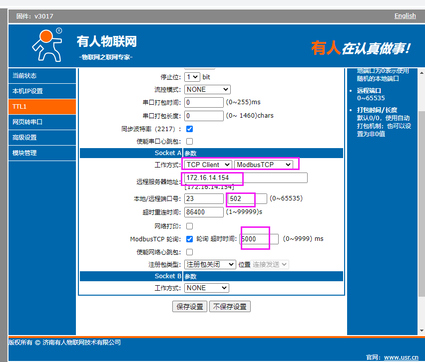 網(wǎng)頁檢查串口參數(shù),工作方式設(shè)置TCP server ModbusTCP,本地端口號默認(rèn)是8899,我這邊修改成了8845,Modbus TCP輪詢默認(rèn)是關(guān)閉,需要勾選MODBUS TCP輪詢時間。保存設(shè)置,重啟參數(shù)生效。