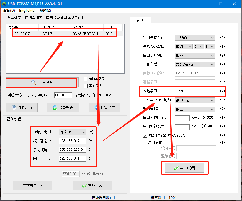 4、打開設(shè)置軟件,點(diǎn)擊“搜索設(shè)備”當(dāng)搜索列表中出現(xiàn)K7的設(shè)備后,點(diǎn)擊搜索到的設(shè)備,模塊工作方式設(shè)為TCP SERVER,本地端口5523,點(diǎn)擊保存參數(shù)。