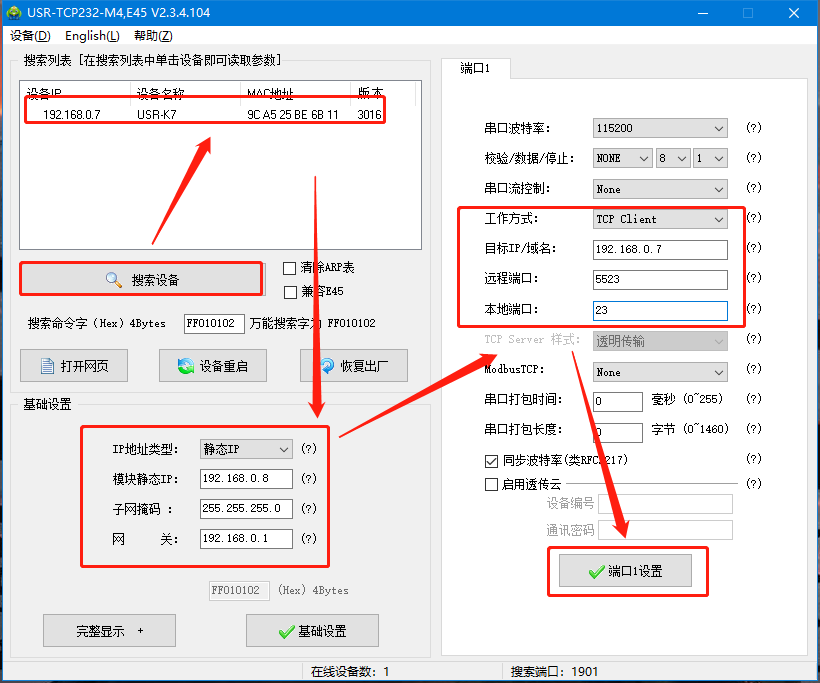 5、點(diǎn)擊“搜索設(shè)備”當(dāng)搜索列表中出現(xiàn)另一臺(tái)K7的設(shè)備后,點(diǎn)擊搜索到的設(shè)備,為了防止IP沖突,將此設(shè)備IP修改為192.168.0.8,模塊工作方式設(shè)為TCP Client,本地端口0,遠(yuǎn)程端口5523,點(diǎn)擊保存參數(shù)。