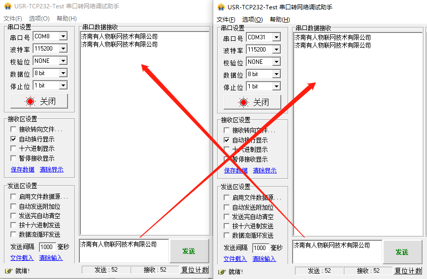 7、打開兩個(gè)串口調(diào)試助手,分別選擇正確的串口以及串口參數(shù),實(shí)現(xiàn)兩個(gè)串口直接數(shù)據(jù)互發(fā)。
