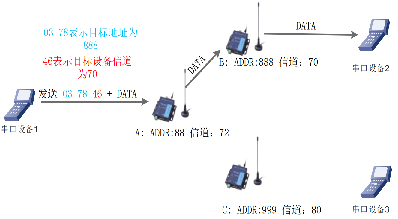 設(shè)備B:定點(diǎn)模式,速率8,信道70,目標(biāo)地址888。