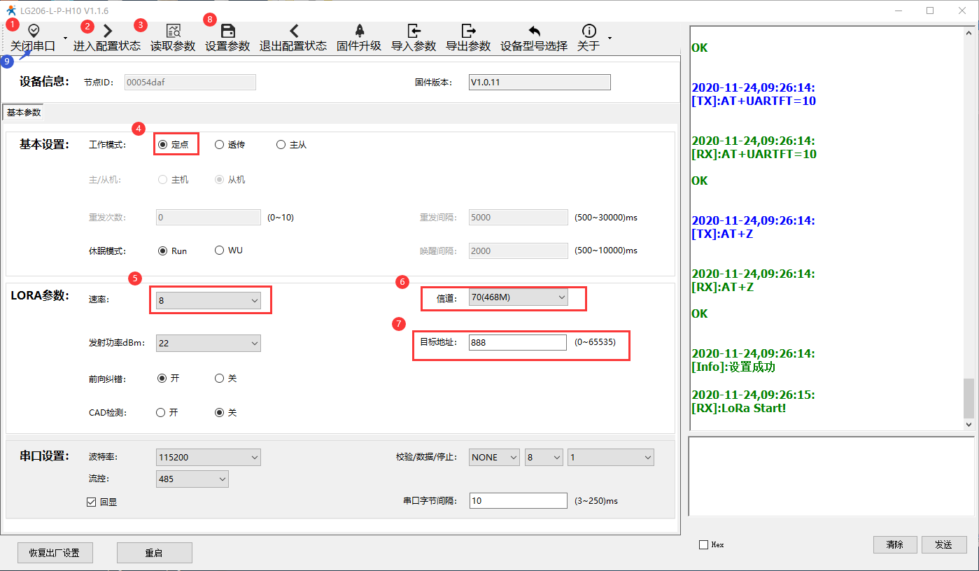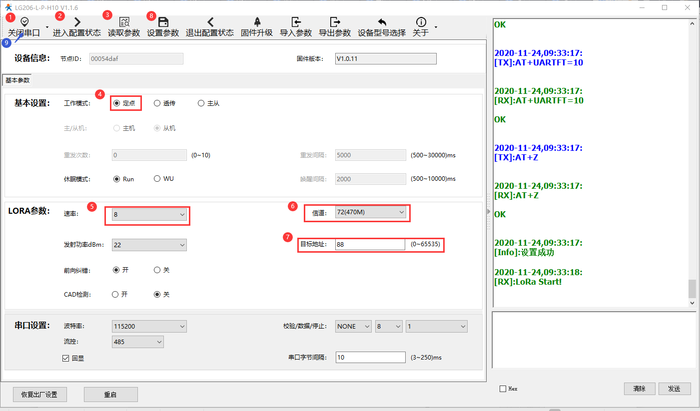 打開LoRa設(shè)置軟件→ 選擇LG206-L-P-H10 → 依次點(diǎn)擊打開串口(選擇A、B對應(yīng)的串口號,串口參數(shù):115200,None,8,1,NFC) → 進(jìn)入配置狀態(tài) → 讀取參數(shù) → 配置圖中的參數(shù) → 一鍵設(shè)置所有參數(shù) → 關(guān)閉LoRa設(shè)置軟件。
