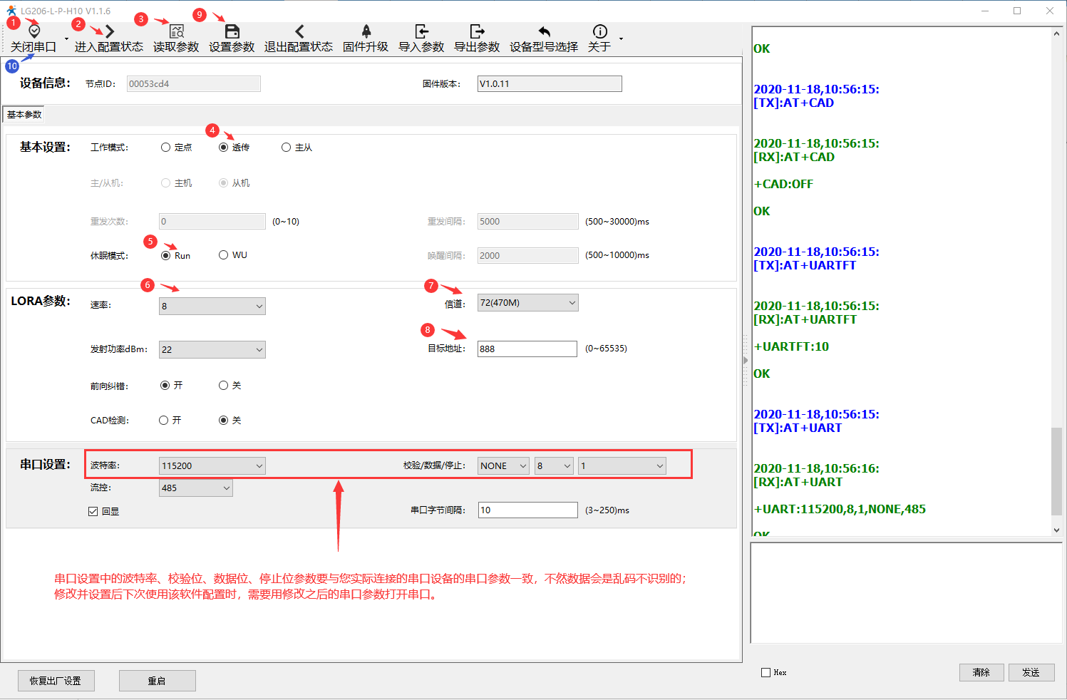 廣播設(shè)備參數(shù):透?jìng)髂J?,速率等?jí)8,信道72,目標(biāo)地址65535。