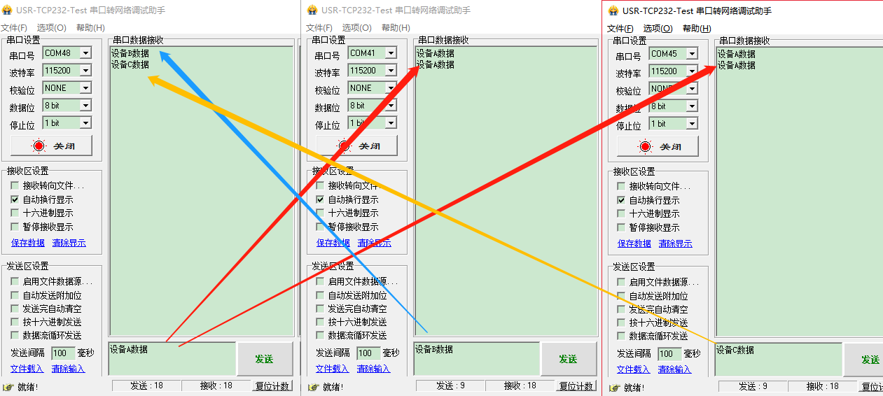 啟動(dòng)三個(gè)USR-TCP232-Test(模擬串口設(shè)備1,2,3)分別連接LoRa數(shù)傳廣播端A、接收端B、C的串口,使用串口設(shè)備1發(fā)送數(shù)據(jù),串口設(shè)備2、3可接收數(shù)據(jù),設(shè)備2、3的數(shù)據(jù)可以發(fā)送給設(shè)備1,通信效果如下圖所示: