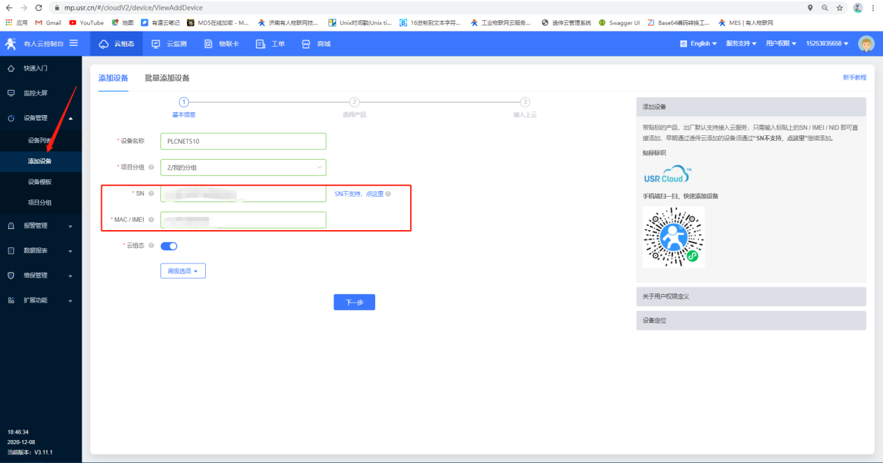 1.登錄有人云賬號和密碼,點擊添加設(shè)備,輸入PLCNET510的SN和MAC,點擊下一步