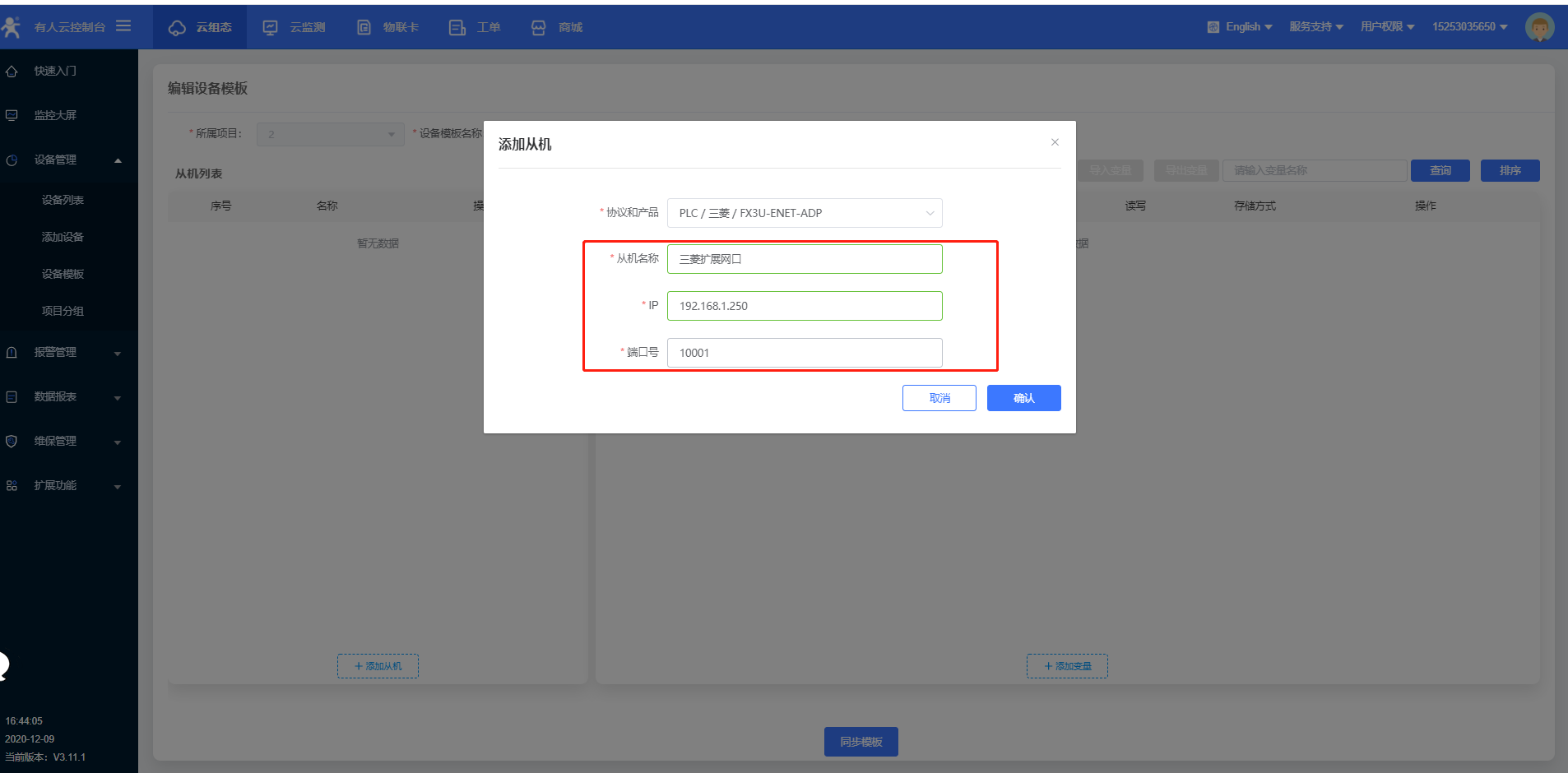 3.下一步填寫從機和變量,IP為三菱PLC的IP,端口為三菱PLC的端口