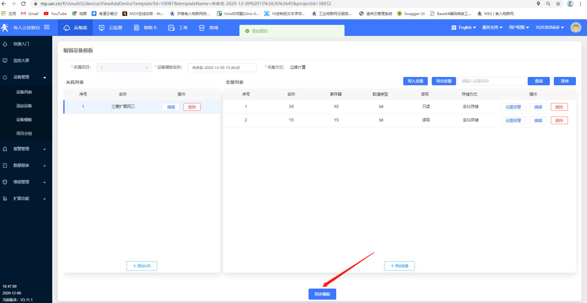 5.點擊同步模板,云端設(shè)備添加完成,等待上線