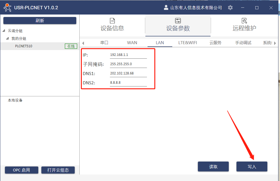 7.設(shè)備參數(shù)LAN口IP和PLC的IP在同一個網(wǎng)段