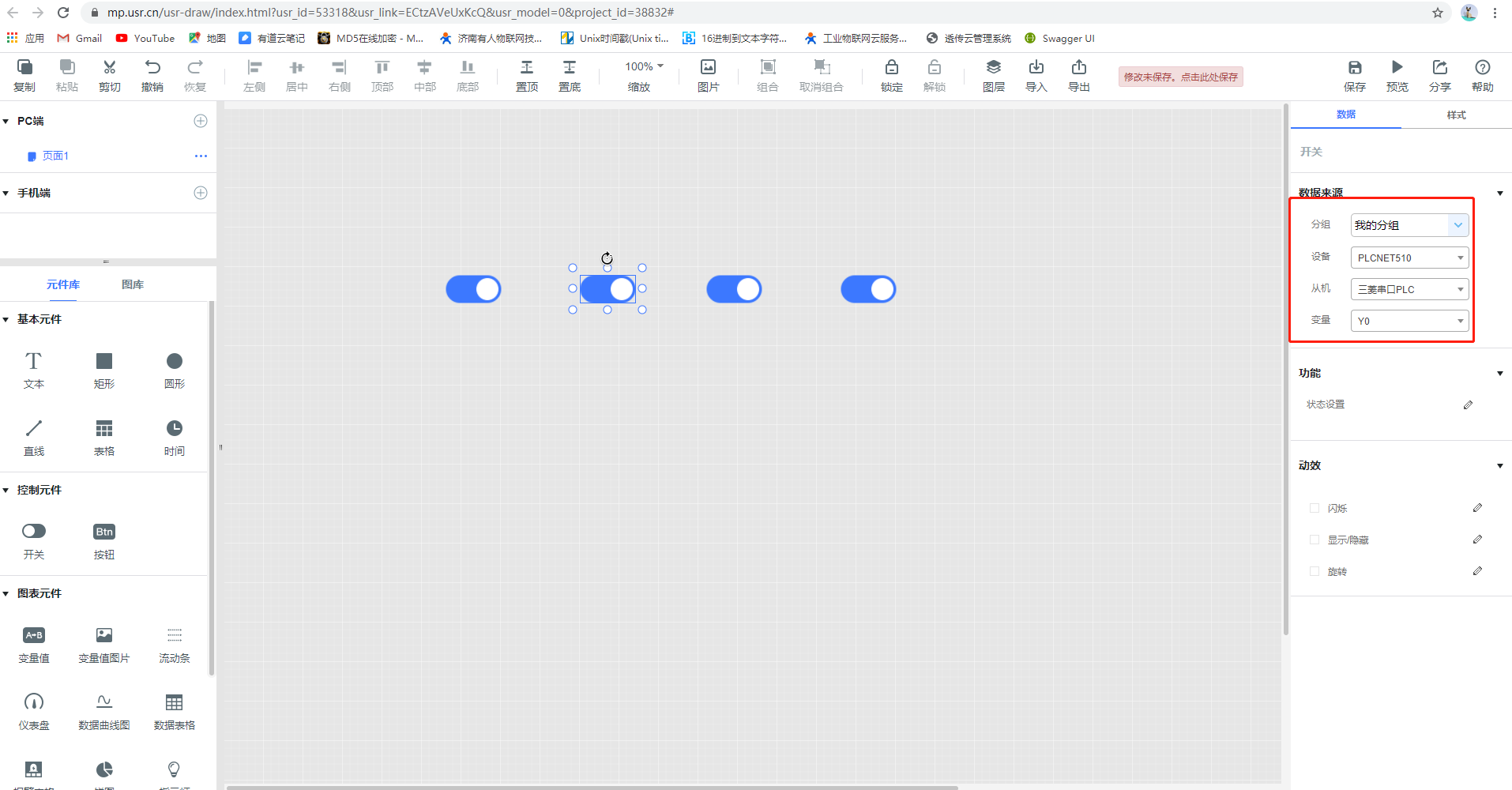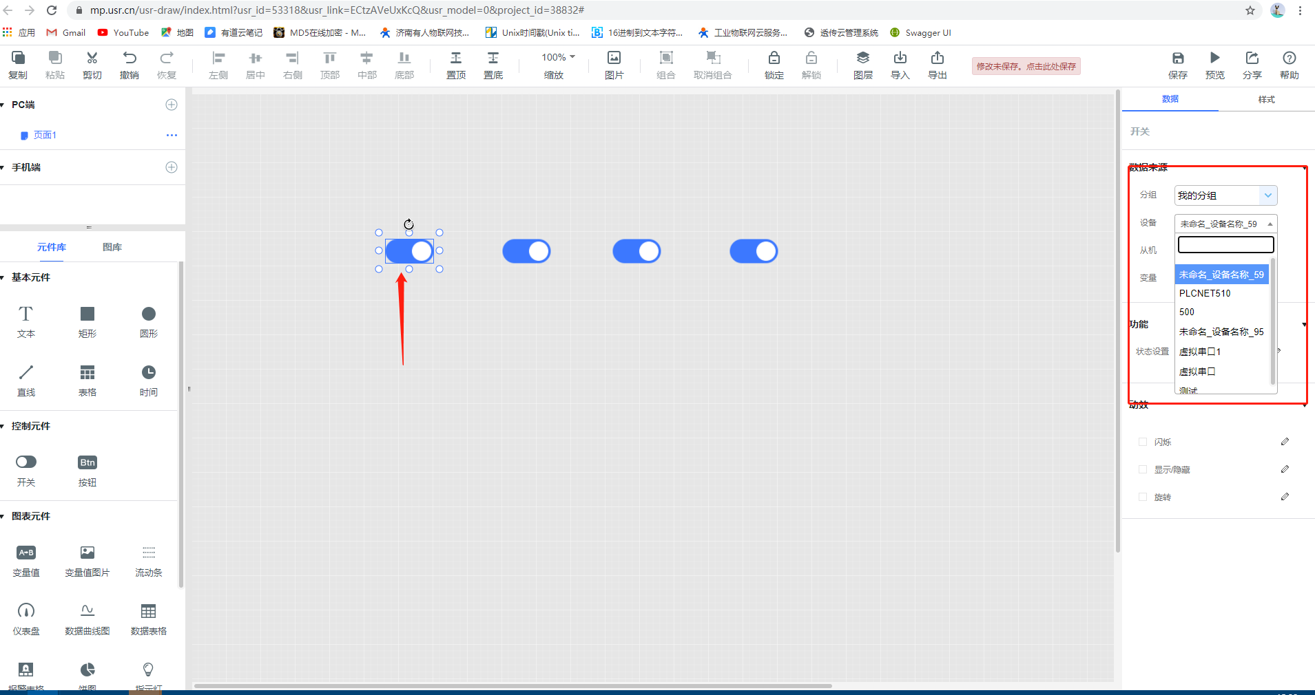 4.添加控件,一個組態(tài)畫面添加多個控件,可以同時關聯(lián)多個設備下的多個數(shù)據(jù)點,注意:獨立組態(tài)不支持監(jiān)控大屏顯示