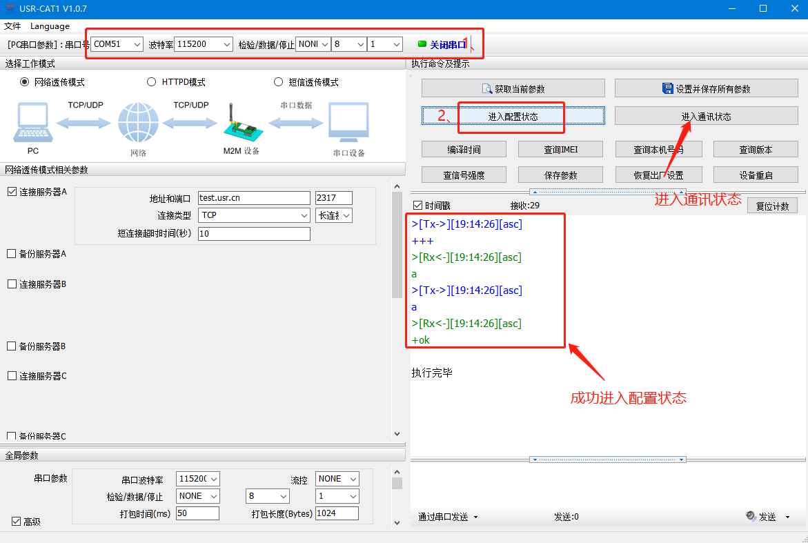 4、點(diǎn)擊進(jìn)入配置狀態(tài)返回+++ a a+ok是正確進(jìn)入配置狀態(tài)