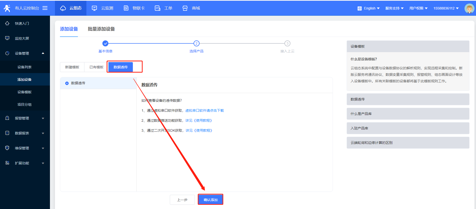 4>再添加一個(gè)設(shè)備,用于虛擬串口軟件,選擇數(shù)據(jù)透傳,添加成功后可以在設(shè)備列表中看到