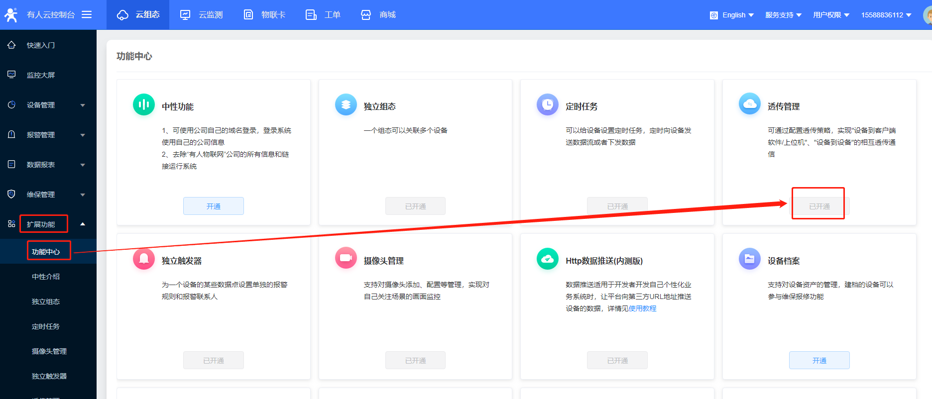 5>擴(kuò)展功能--功能中心---開通透傳管理(如果已開通,請忽略此步驟)