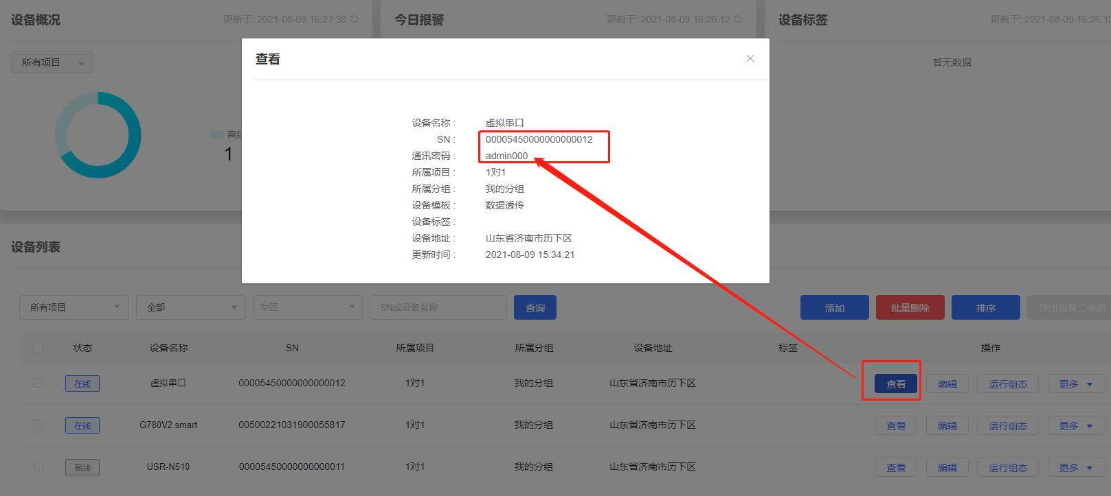 啟用透傳云:設(shè)備編號和通訊密碼見下圖,直接復(fù)制到虛擬串口軟件的編號和密碼即可