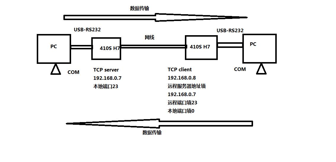 USR-TCP232-410S H7產(chǎn)品,DB9公頭接DB9母頭對母頭轉(zhuǎn)接線,轉(zhuǎn)接線接USB-RS232 DB9公頭,USB頭插入電腦USB口。410S網(wǎng)口通過網(wǎng)線直連電腦網(wǎng)口。檢查所有連接無誤后,給410S用12V電源適配器供電。分別設(shè)置參數(shù),設(shè)置完參數(shù),兩個410S網(wǎng)線直連。