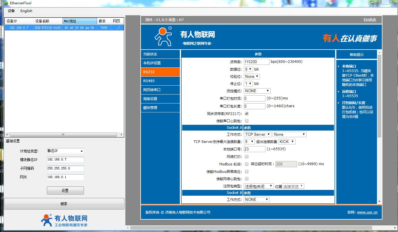 其中第1個410S IP設(shè)置192.168.0.7,RS232串口參數(shù)設(shè)置TCP server,本地端口號23