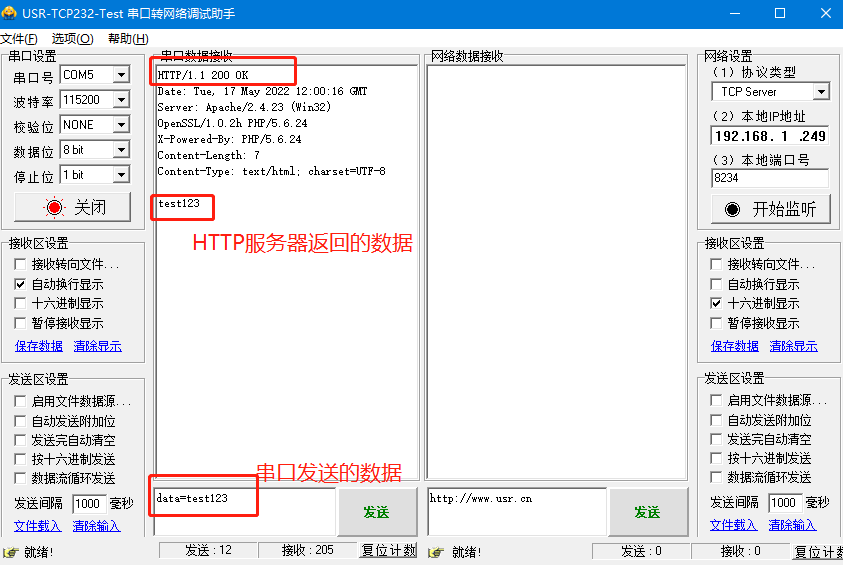 打開串口調(diào)試助手,通過串口發(fā)送test123,能夠收到http服務器的返回,因為在G806s上沒有勾選過濾頭信息,所以服務器返回的頭信息我們在串口也可以看到。