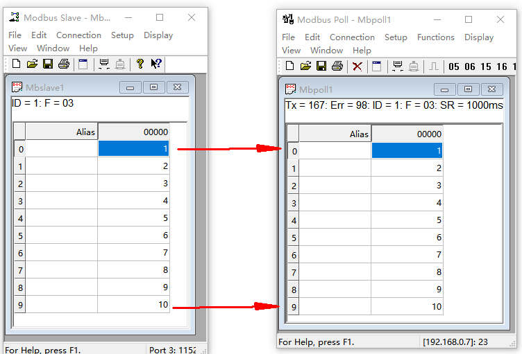 模擬測試用MODBUS SLAVE軟件做串口設(shè)備,用MODBUS POLL軟件做網(wǎng)絡(luò)端。