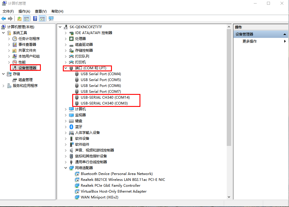 點(diǎn)擊電腦計(jì)算機(jī),右擊鼠標(biāo),點(diǎn)擊設(shè)備管理器,查看端口,確認(rèn)2條USB-RS485串口線的COM口號(hào),有人測試電腦是COM3和COM14