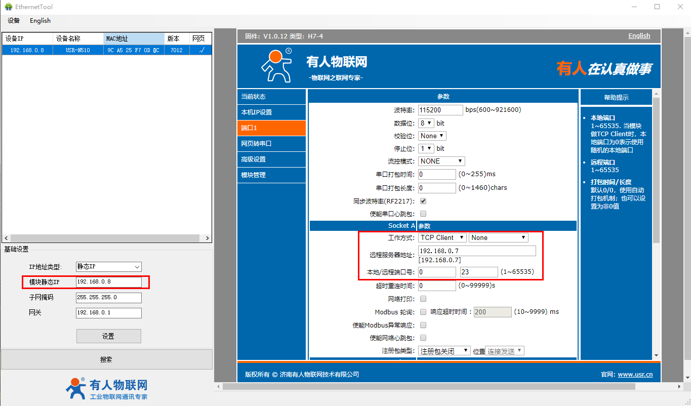 第一個(gè)N510 IP192.168.0.7檢查端口1的RS485參數(shù)
