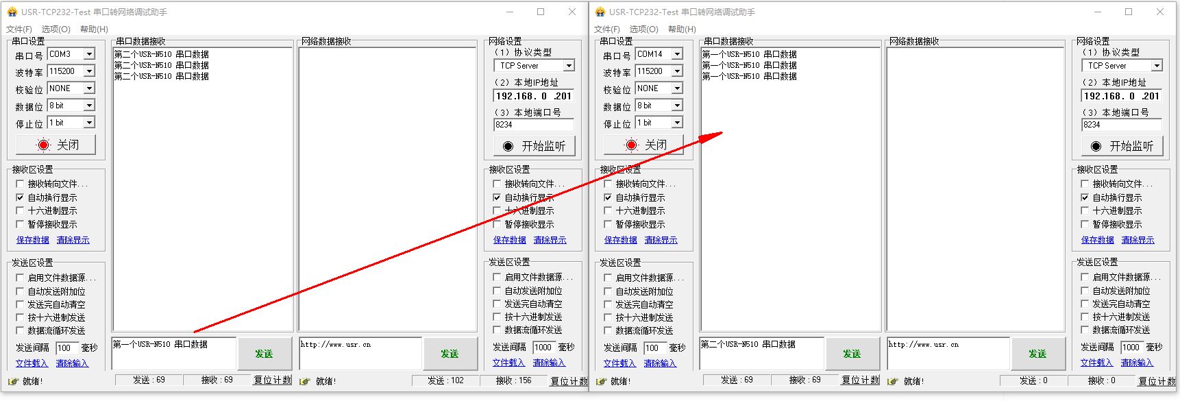 兩個(gè)N510的2個(gè)網(wǎng)口用一根網(wǎng)線直連,兩個(gè)N510的串口分別接USB-RS485串口線接電腦,打開2個(gè)串口助手,對(duì)應(yīng)各自N510串口參數(shù)。