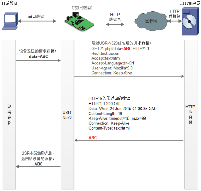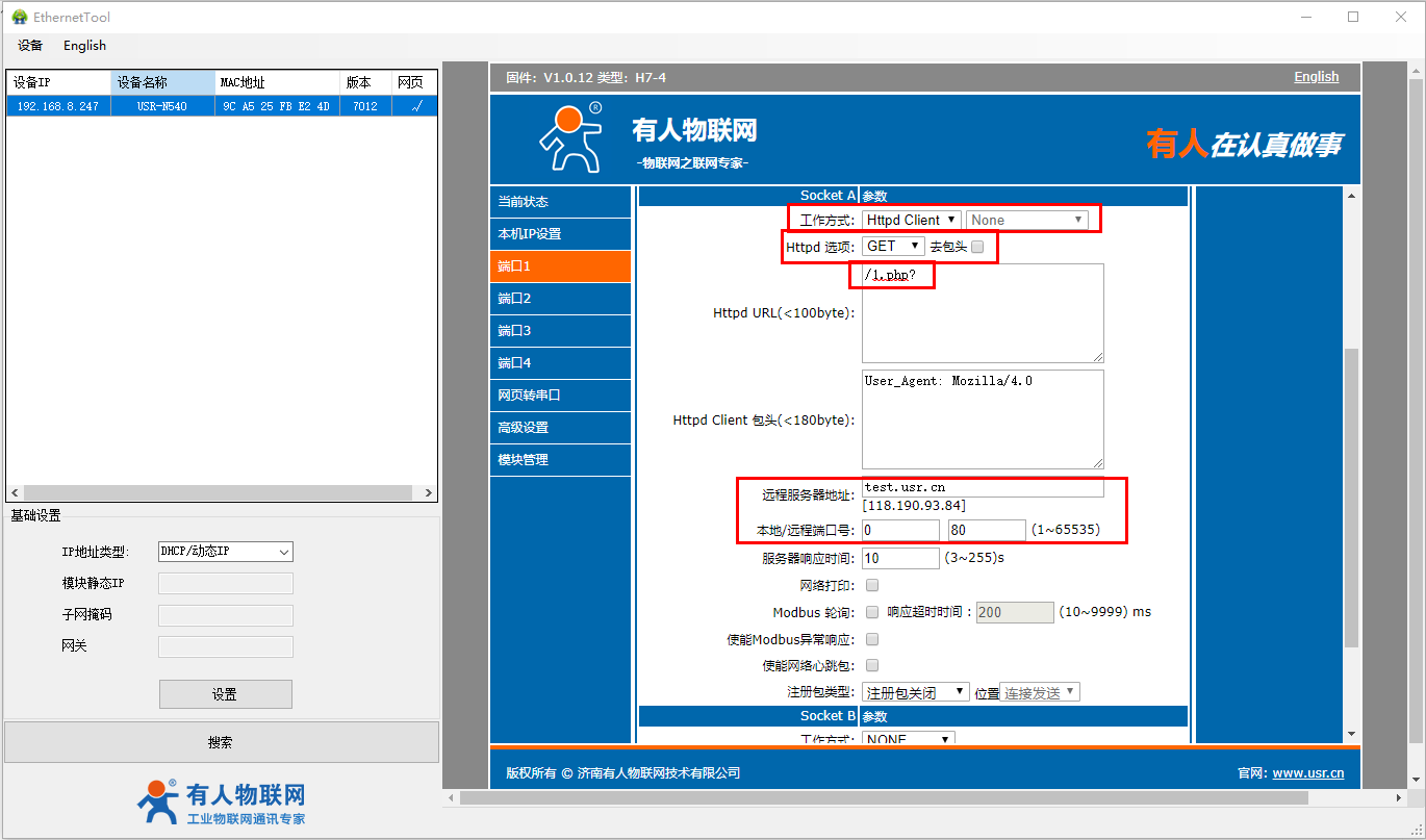 N540端口1工作方式設(shè)置HTTPD模式,GET,遠程服務(wù)器地址填test.usr.cn,遠程端口填80,本地端口號設(shè)置為0。URL填/1.php?,不濾除報頭。