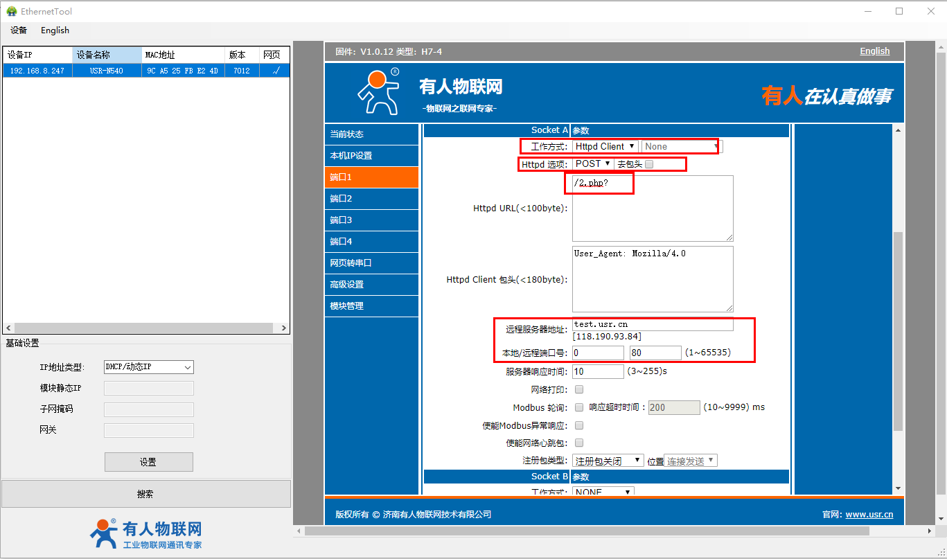 N540端口1工作方式設(shè)置HTTPD模式,POST,遠(yuǎn)程服務(wù)器地址填test.usr.cn,遠(yuǎn)程端口填80,本地端口號設(shè)置為0。URL填/2.php?,不濾除報(bào)頭。