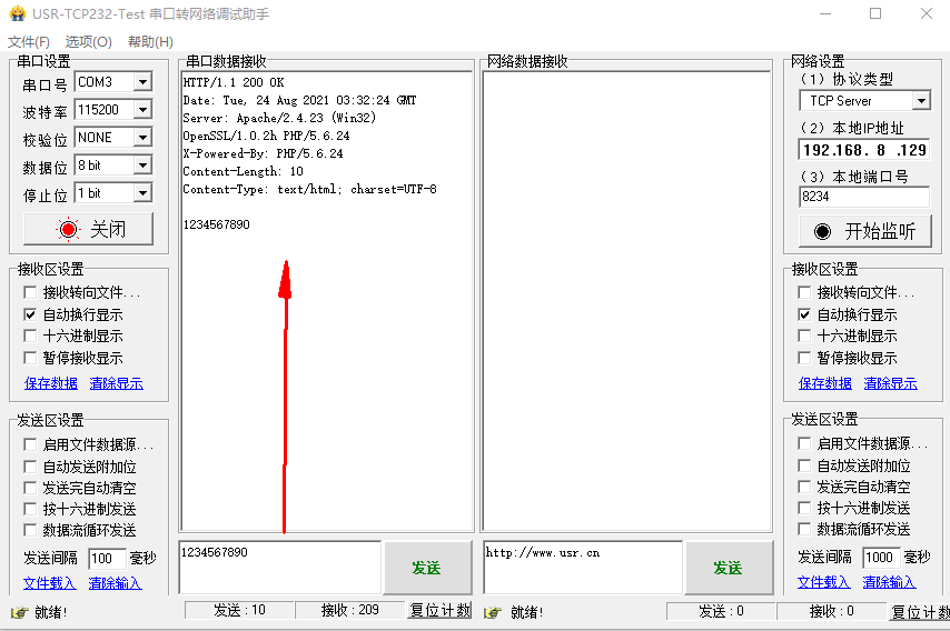 打開串口網(wǎng)絡(luò)助手,串口參數(shù)和N540 端口1參數(shù)保持一致,串口發(fā)送數(shù)據(jù)1234567890,測試服務(wù)器返回?cái)?shù)據(jù)。