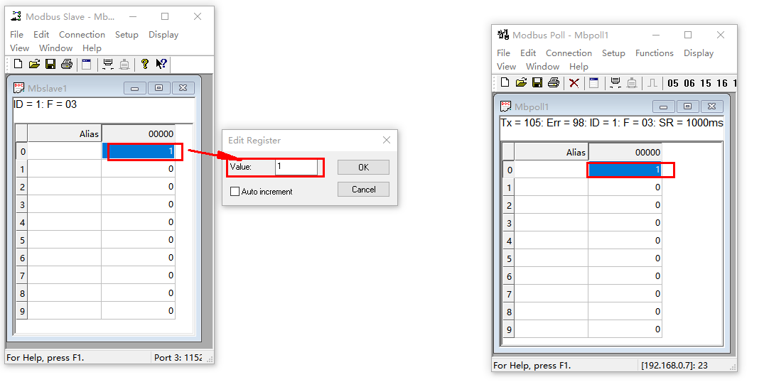 模擬測(cè)試用MODBUS SLAVE軟件做串口設(shè)備,用MODBUS POLL軟件做網(wǎng)絡(luò)端。