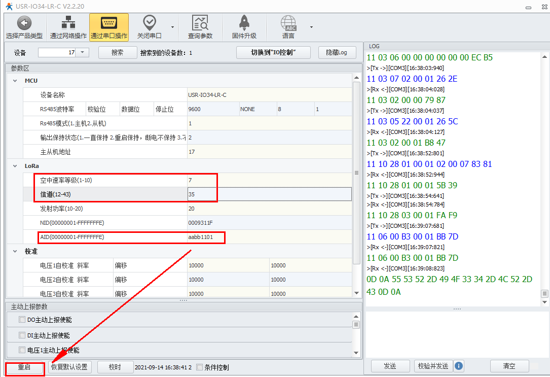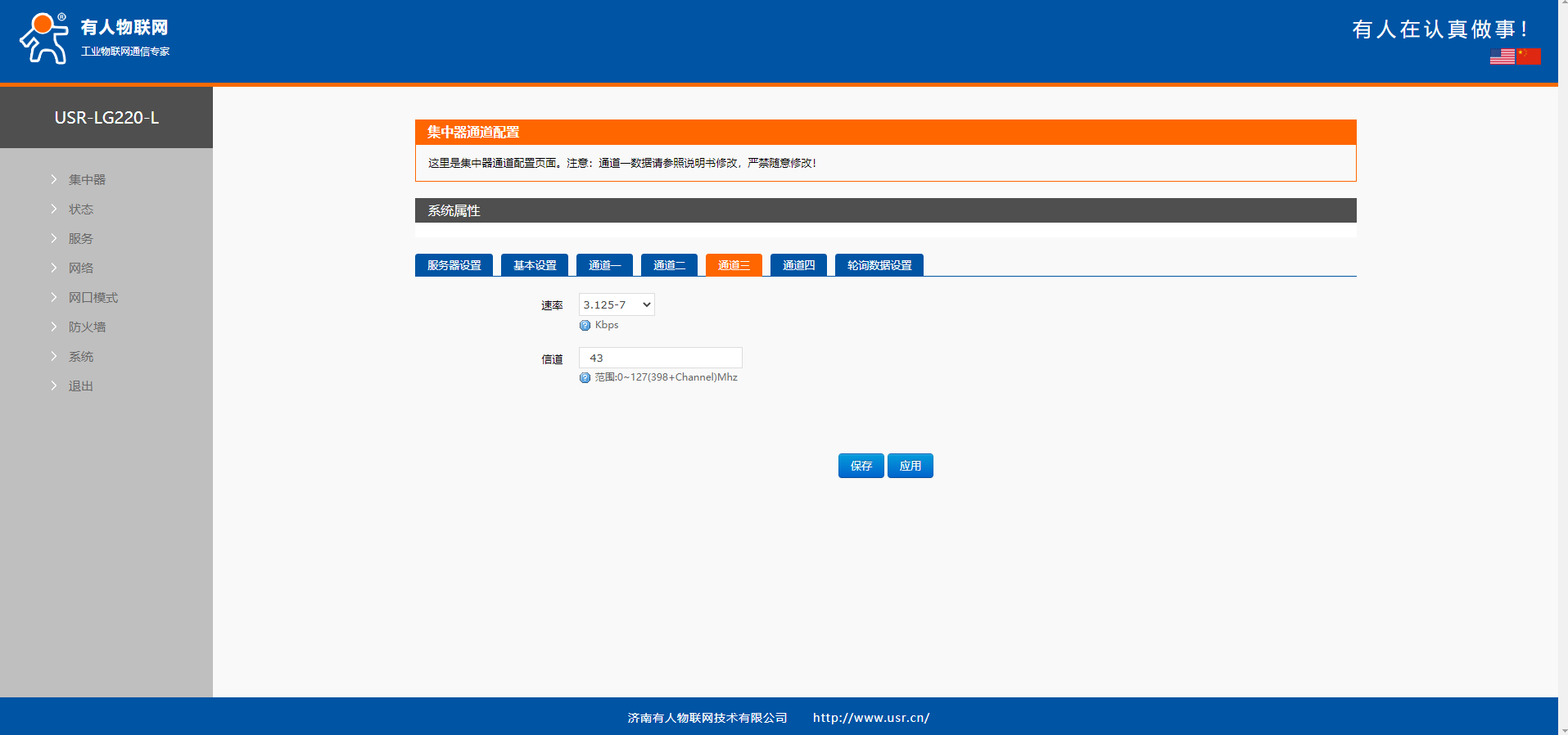 3、修改USR-IO34-LR-C的空中速率等級(jí),設(shè)置為7。信道設(shè)置為35,和USR-LG220-L的通道一速率、信道保持一致。