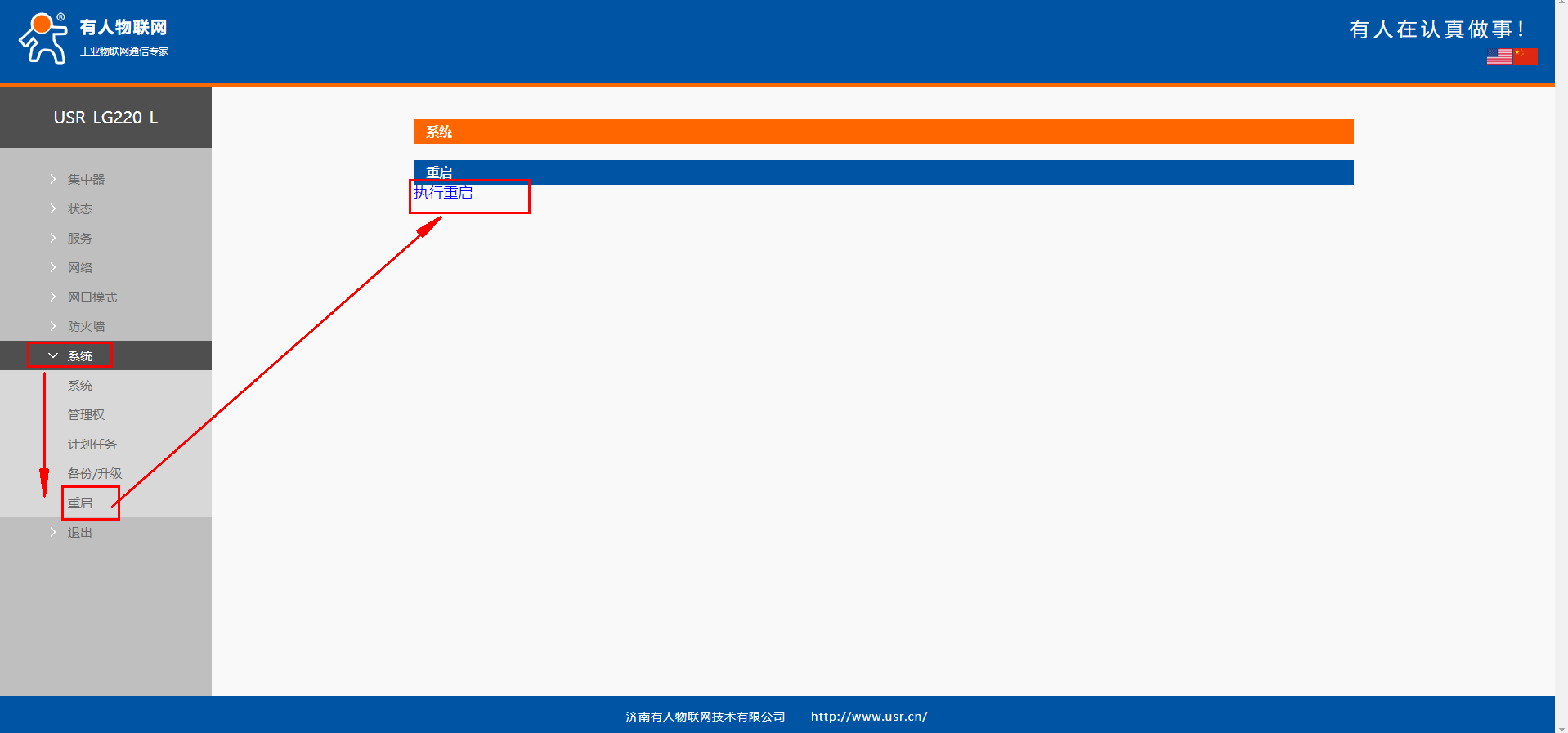 4、USR-LG220-L網(wǎng)頁(yè)系統(tǒng),點(diǎn)擊重啟,執(zhí)行重啟。等待一段時(shí)間,等待USR-LG220-L重啟完畢。