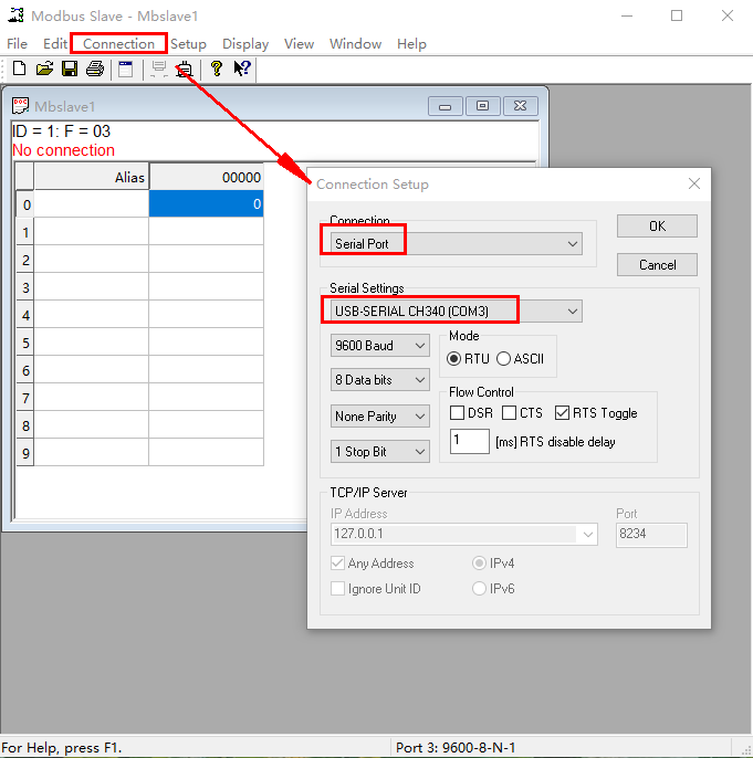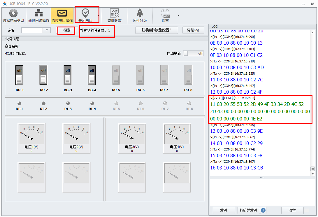 打開(kāi)串口,用USB-RS485的COM口號(hào)打開(kāi),使用IO34-LR-C默認(rèn)的串口參數(shù),9600,NONE,8,1