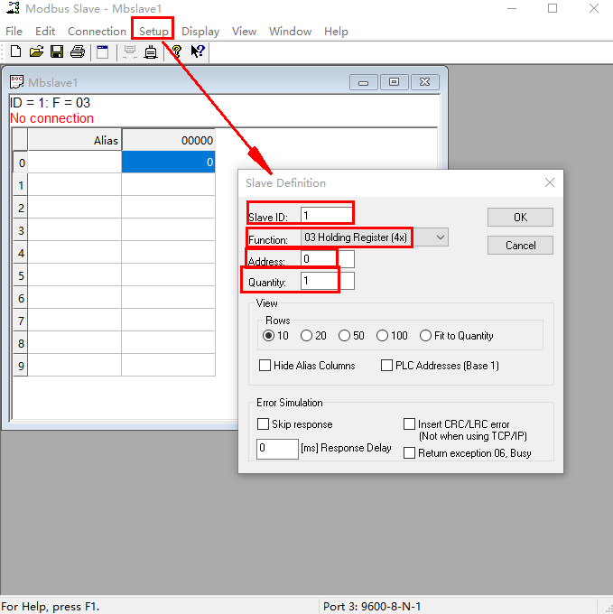 點(diǎn)擊Setup,設(shè)置從機(jī)地址,Slave ID 設(shè)置485從機(jī)地址1,F(xiàn)unction用03功能碼,Address是寄存器起始地址用0,Quantity設(shè)置從寄存器起始開(kāi)始的寄存器數(shù)量,用1。
