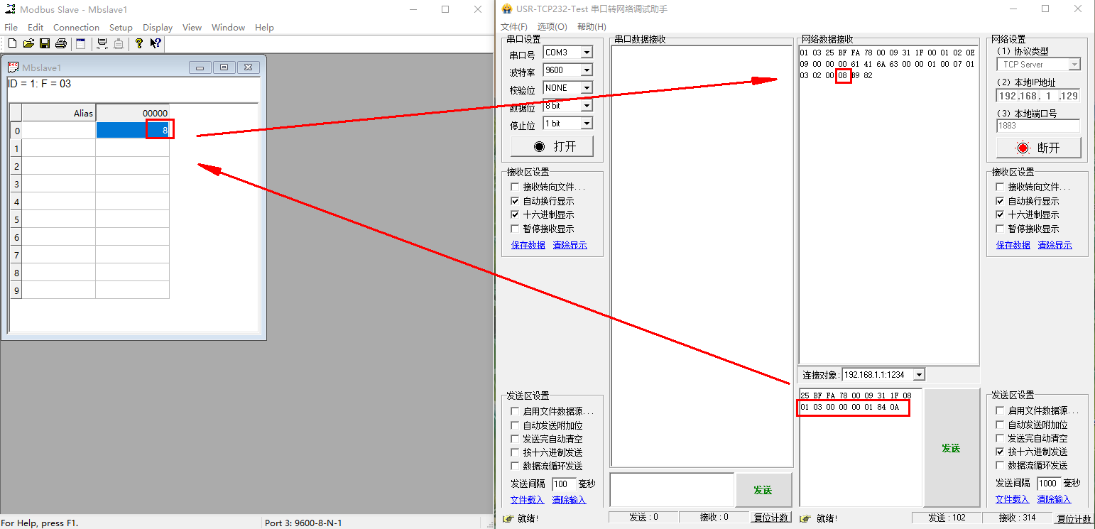 網(wǎng)絡(luò)端發(fā)送和接收都勾選十六進(jìn)制顯示和接收,然后網(wǎng)絡(luò)端按照USR-LG220-L的服務(wù)器主動(dòng)下發(fā)協(xié)議,輸入命令,去讀取USR-IO34-LR-C 接的485從機(jī)地址1,寄存器地址0的數(shù)據(jù)。