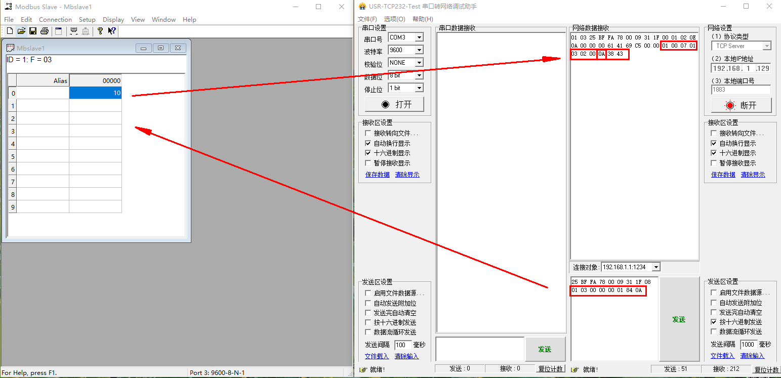 1、USR-IO34-LR-C 使用USB-RS485接電腦,電腦安裝并打開(kāi)MODBUS SLAVE軟件,模擬MODBUS RTU 485串口設(shè)備。