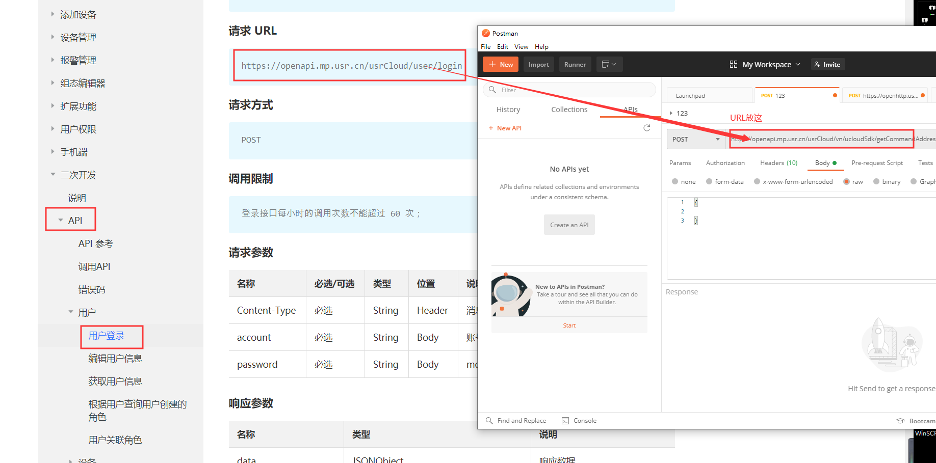 1、在接口文檔中找到用戶登錄接口(二次開發(fā)-API-用戶-用戶登錄)