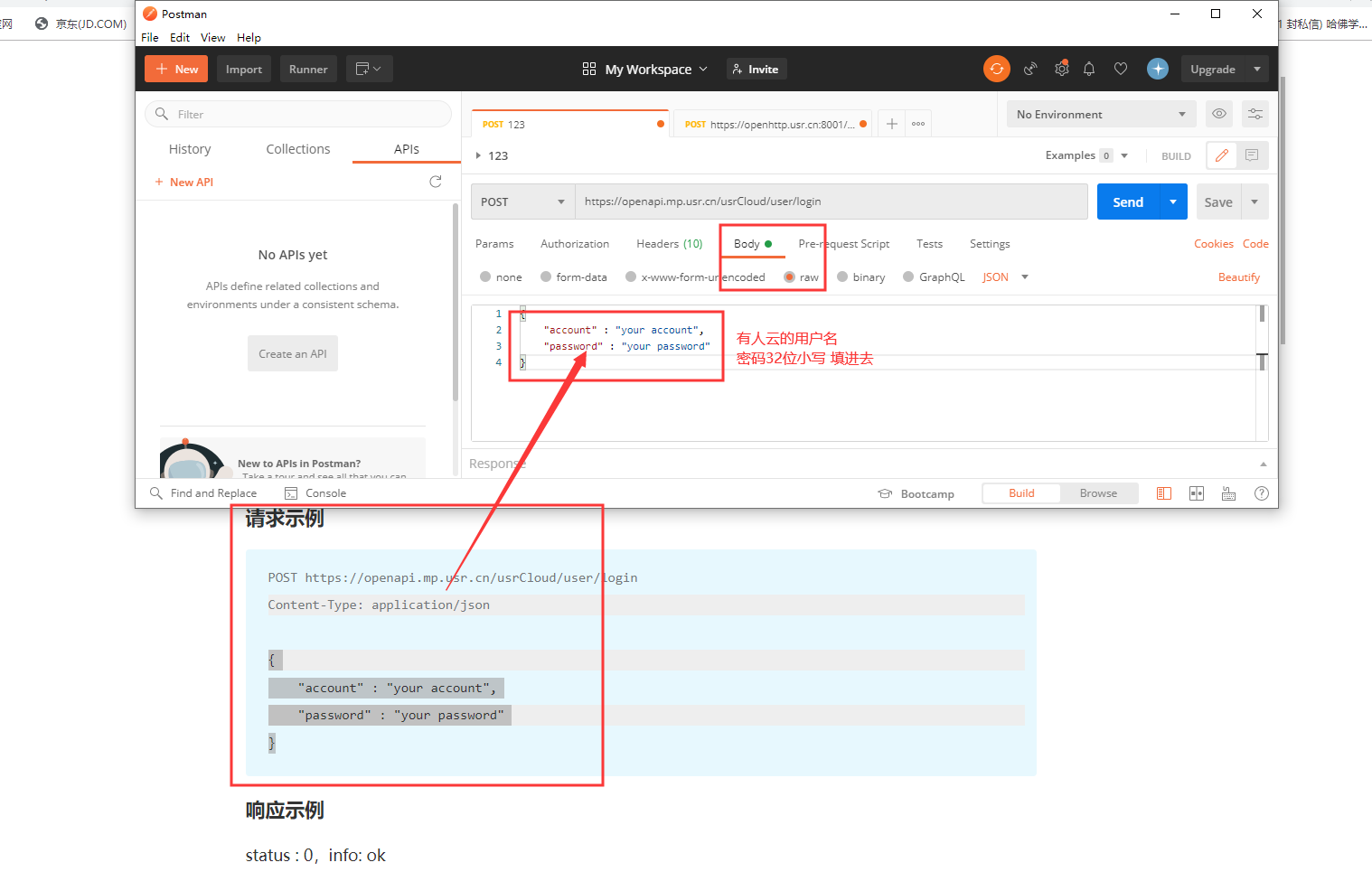 3、將請求示例大括號中得數(shù)據(jù)復(fù)制到body的raw中