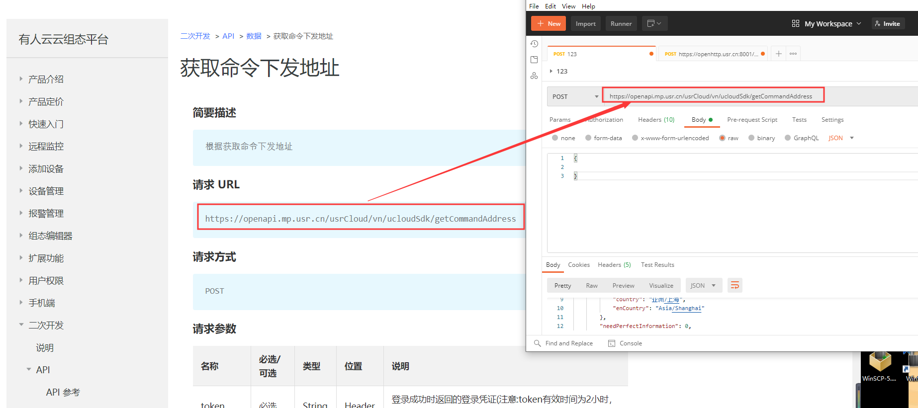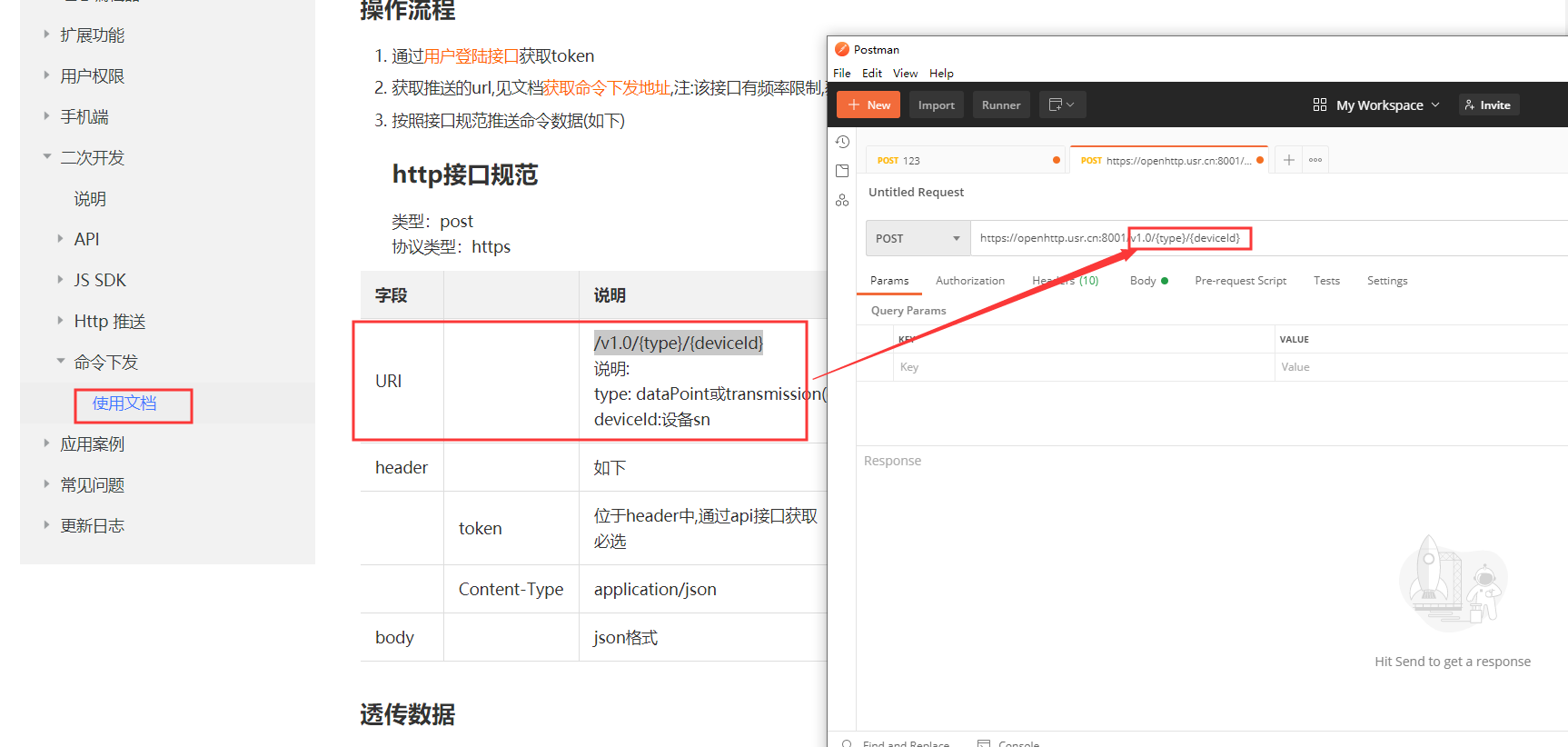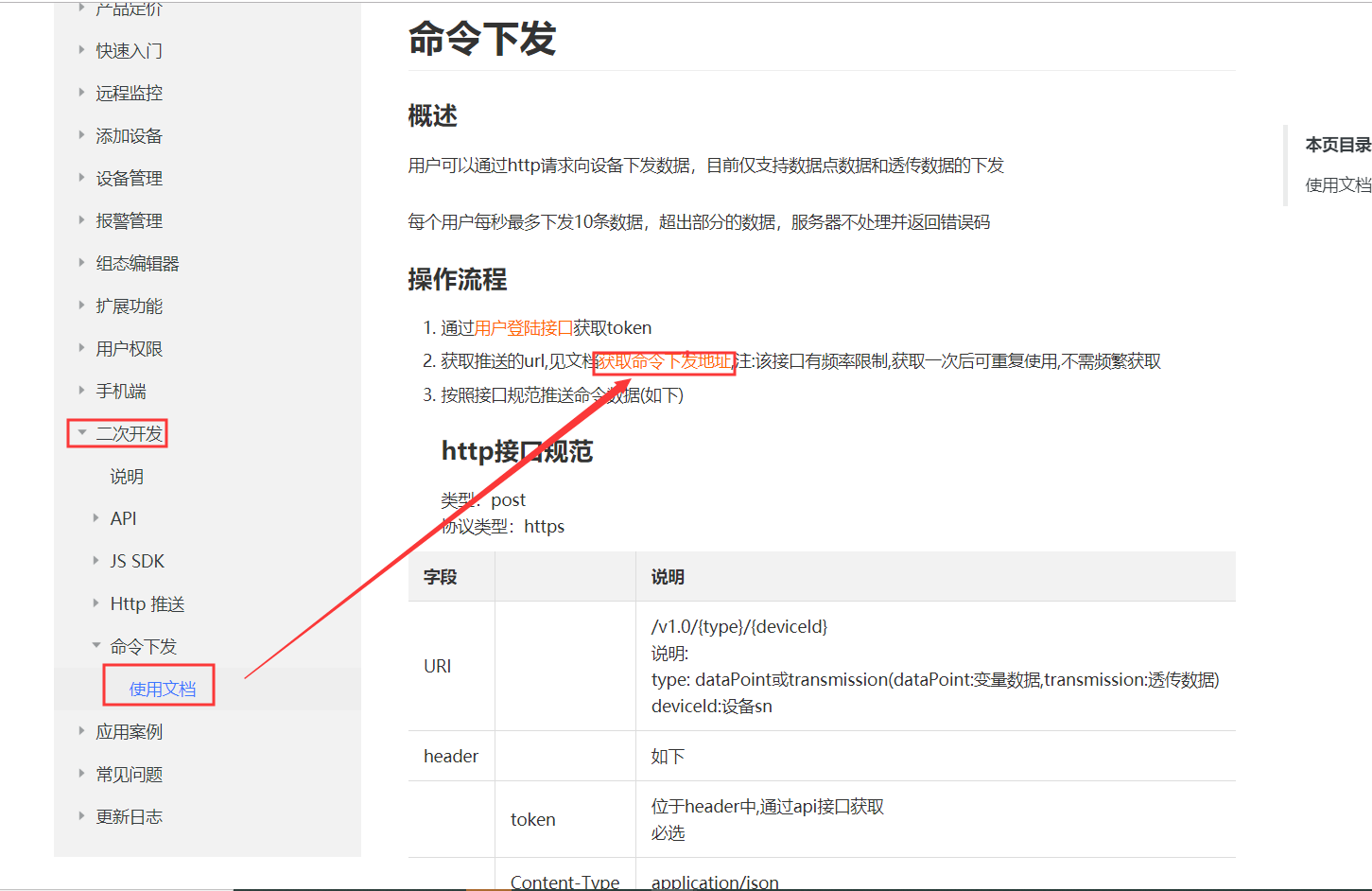 4、在二次開發(fā)文檔界面打開獲取命令下發(fā)地址(二次開發(fā)-命令下發(fā)-使用文檔-獲取命令下發(fā)地址)