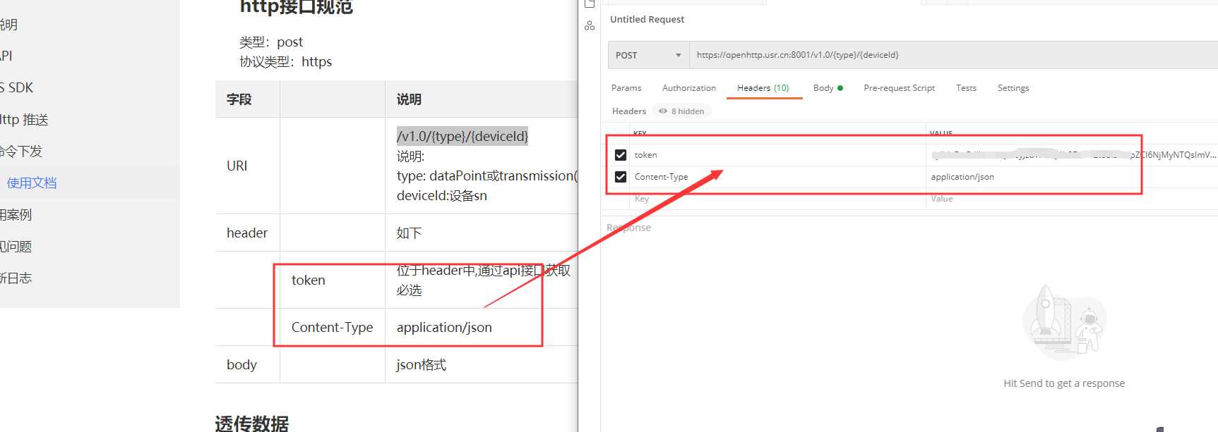 在headers中添加Content-Type和token,值分別為application/json以及剛剛獲取到的token