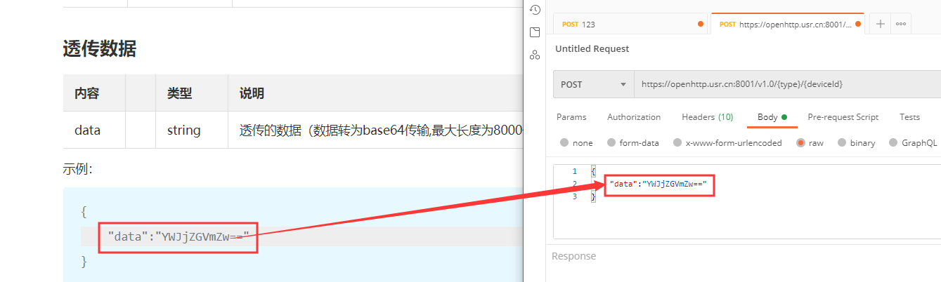數(shù)據(jù)透傳的話填入"data":"YWJjZGVmZw==",其中data中的數(shù)據(jù)為透傳的數(shù)據(jù)(數(shù)據(jù)轉(zhuǎn)為base64傳輸,最大長度為8000個字符)