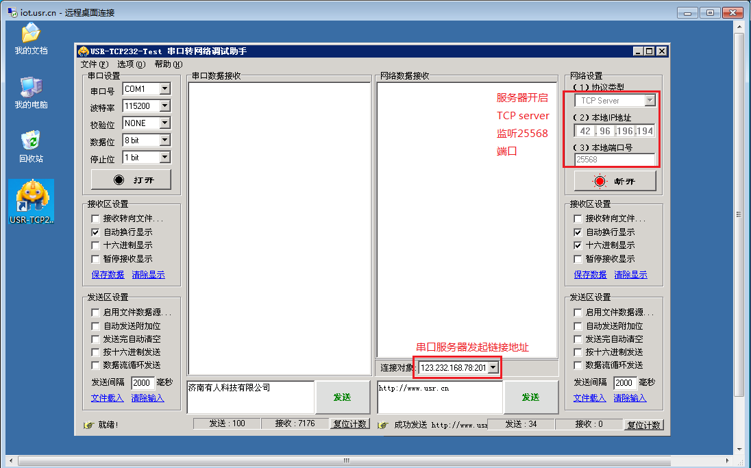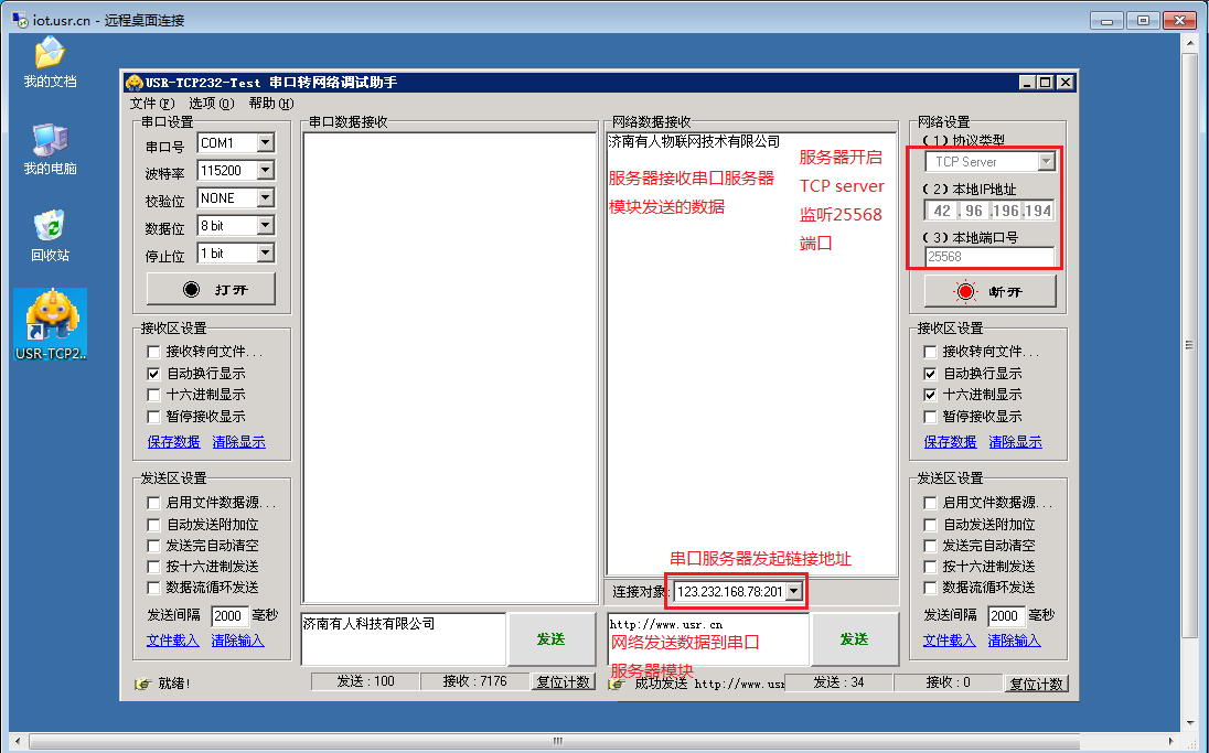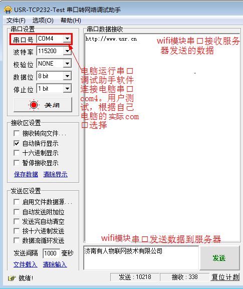 以上是服務(wù)器發(fā)送數(shù)據(jù)和接收數(shù)據(jù):以下使用電腦串口連接WiFi串口串口,電腦運(yùn)行串口調(diào)試軟件,進(jìn)行發(fā)送和接收服務(wù)器的數(shù)據(jù)。