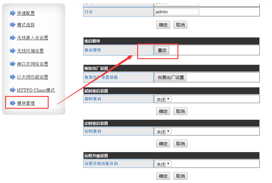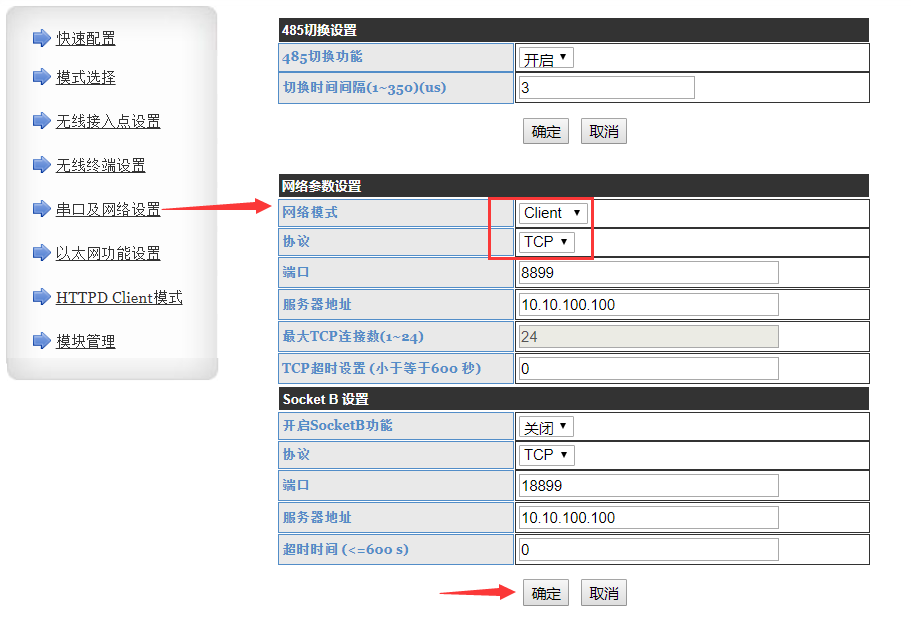 2、電腦瀏覽器地址欄輸入模塊默認IP:10.10.100.254,賬號和密碼都是admin,進入內(nèi)置網(wǎng)頁,模式選擇 -> 數(shù)據(jù)傳輸模式 -> 串口指令模式,點擊確定,串口及網(wǎng)絡(luò)設(shè)置 -> 網(wǎng)絡(luò)參數(shù)設(shè)置 -> 網(wǎng)絡(luò)模式配置為client,點擊確定,重啟模塊。