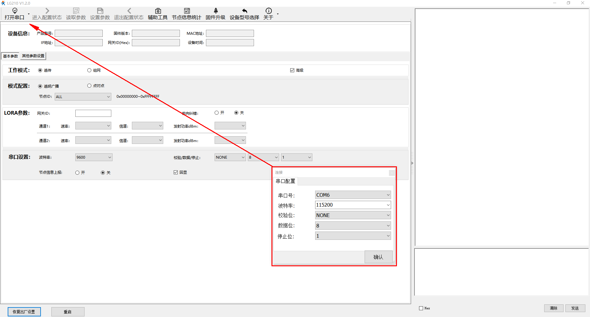 1、電腦打開(kāi)USR-LG210的設(shè)置軟件,打開(kāi)串口,點(diǎn)擊進(jìn)入配置狀態(tài),讀取參數(shù)。