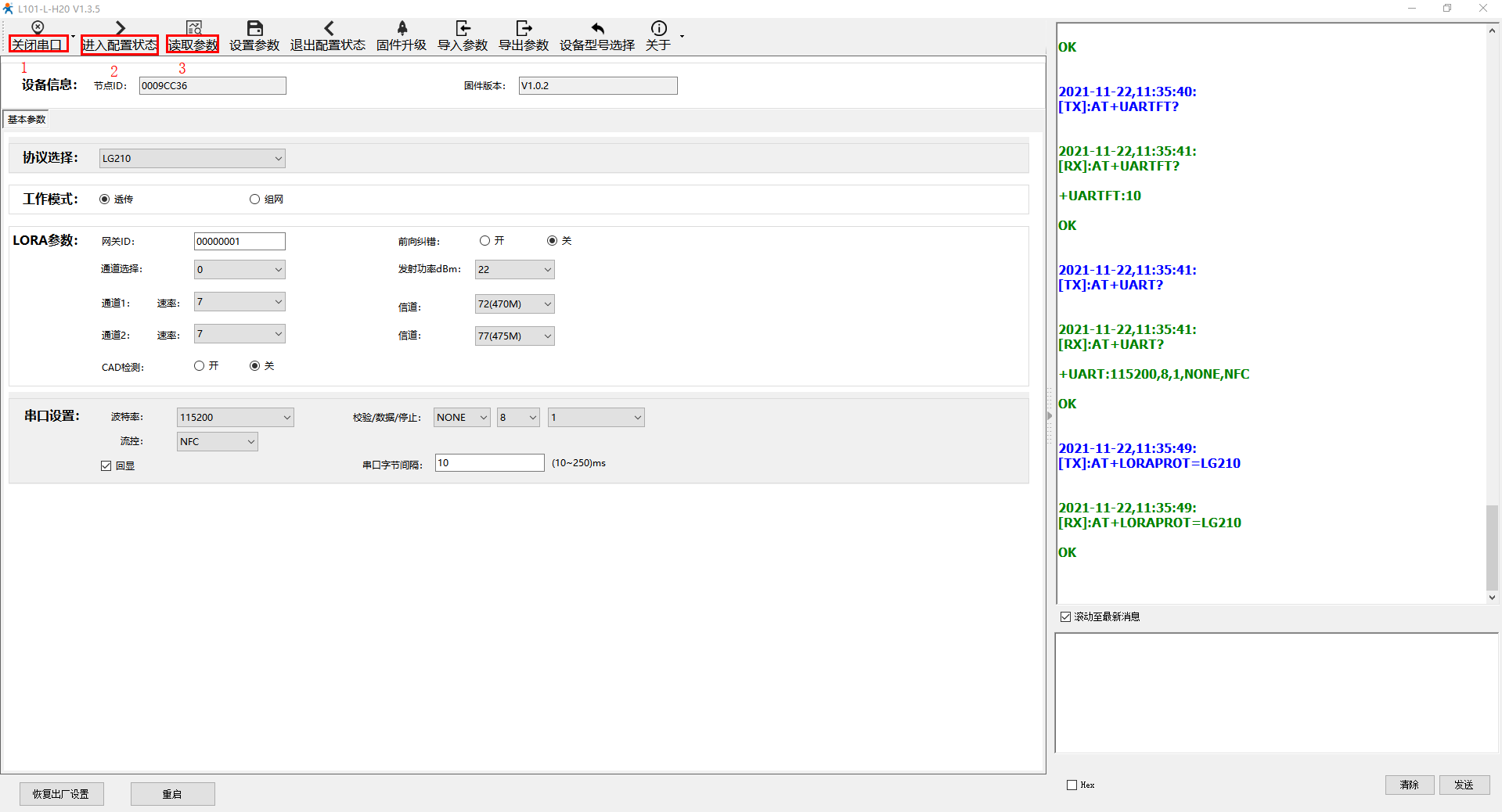 2、用默認(rèn)串口參數(shù)打開(kāi)串口COM4,點(diǎn)擊進(jìn)入配置狀態(tài),讀取參數(shù)。
