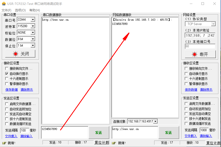 電腦打開(kāi)1個(gè)USR-TCP232-TEST串口軟件,左側(cè)打開(kāi)對(duì)應(yīng)WH-L101-L-H20的USB-RS232串口線COM口號(hào),右側(cè)做TCPserver,本地IP地址填電腦IP地址,本地端口號(hào)填60。