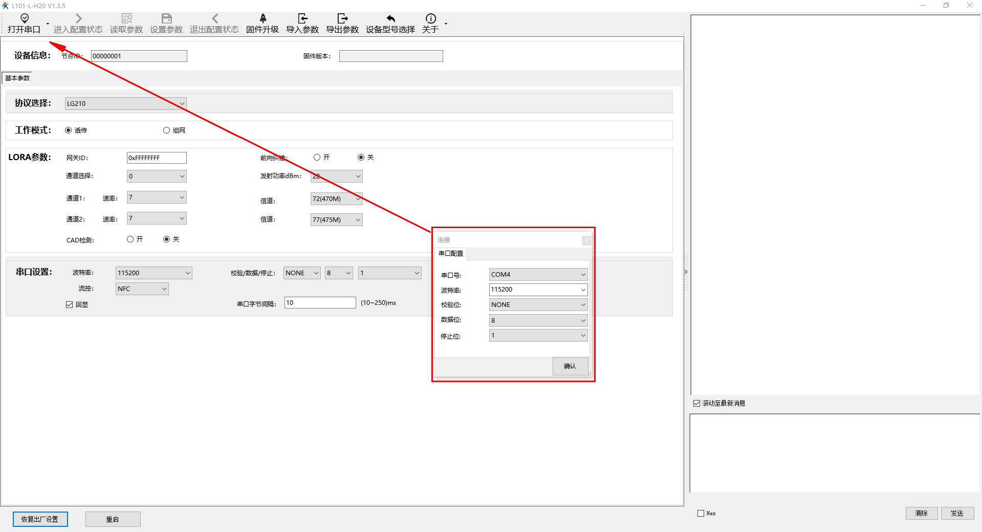 2、用默認串口參數打開串口COM4,點擊進入配置狀態(tài),讀取參數。